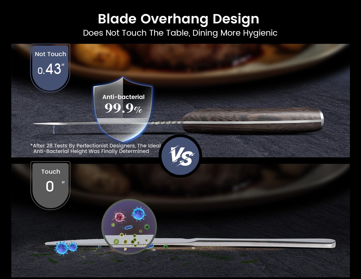 Considering the ordinary steak knife in contact with the table during the meal caused by the staining health hazards and increased cleaning burden, we overturned the traditional steak knife design after 28 repeated tests and finally determined the 0.43-inch blade suspension height to ensure the health of your and your family