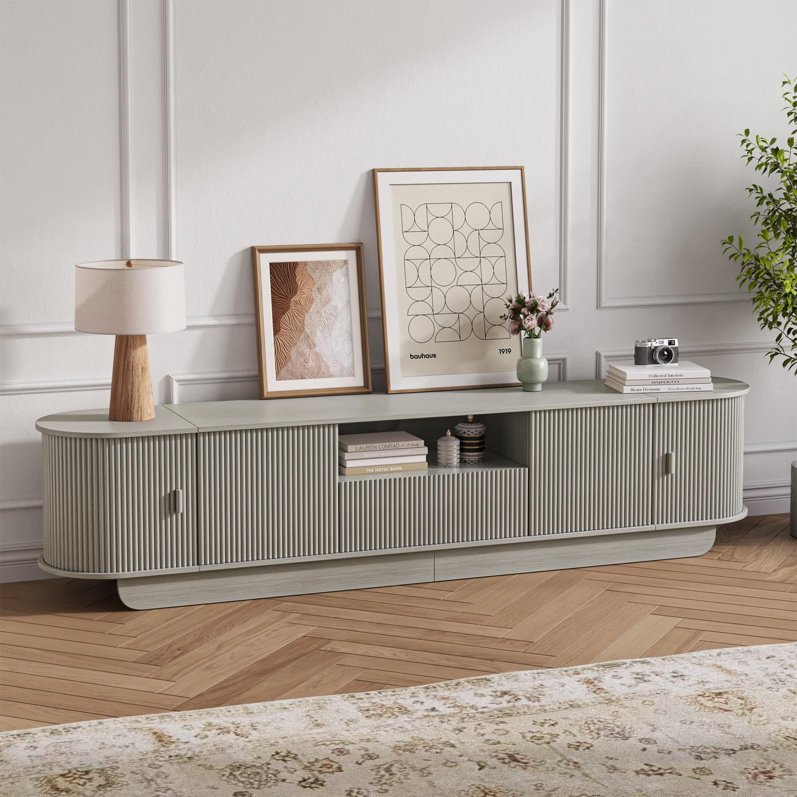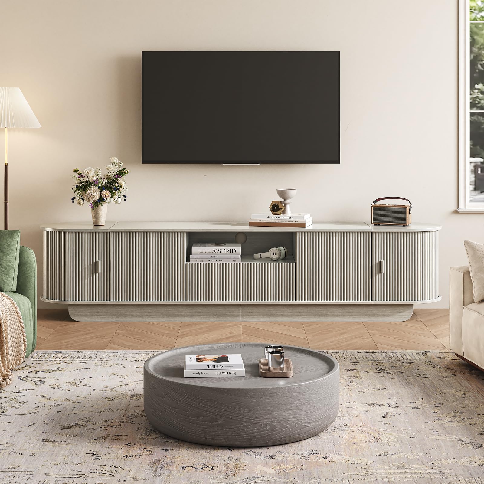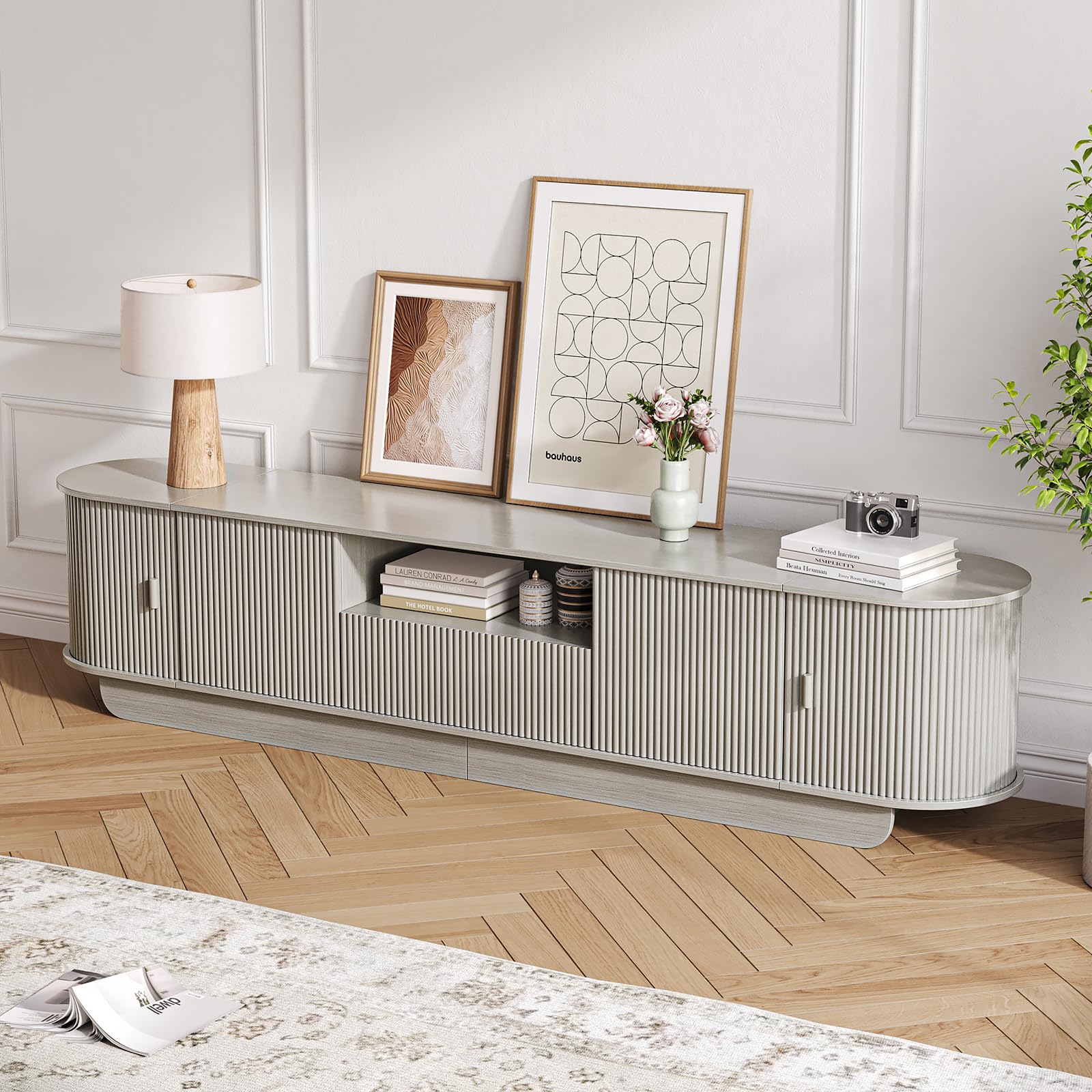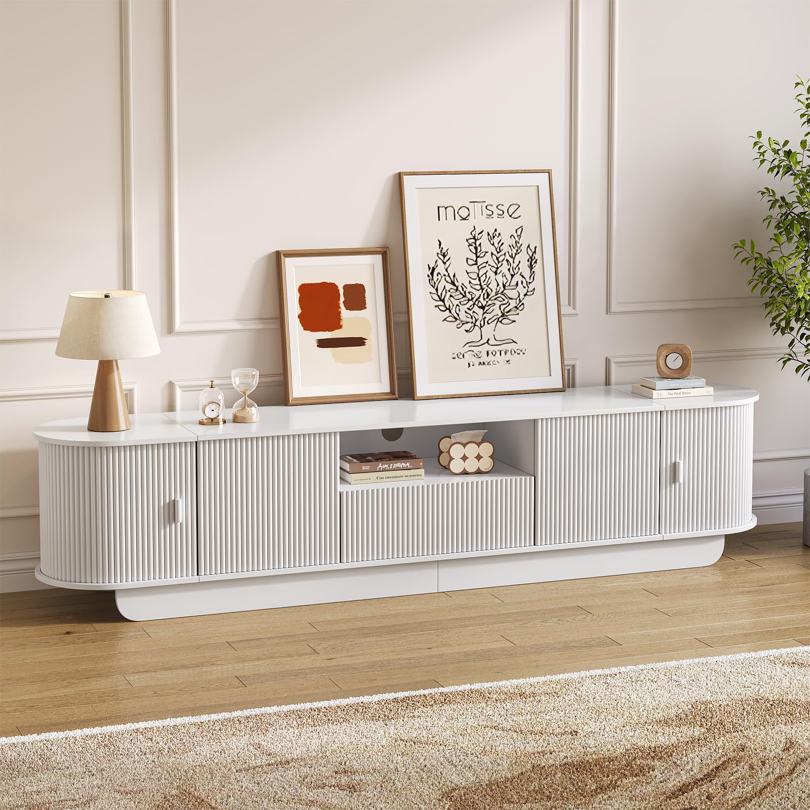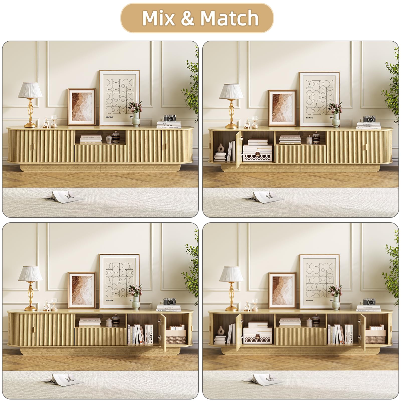 • 【Spacious & Fit for Large TVs】Designed for big screens, tambour TV stand: 86.61" L × 15.75" W × 18" H, comfortably accommodating TVs from 65" to 85". Its expansive surface provides ample space for your entertainment setup, ensure stability without overwhelming your space, while enhancing your living room’s aesthetic.