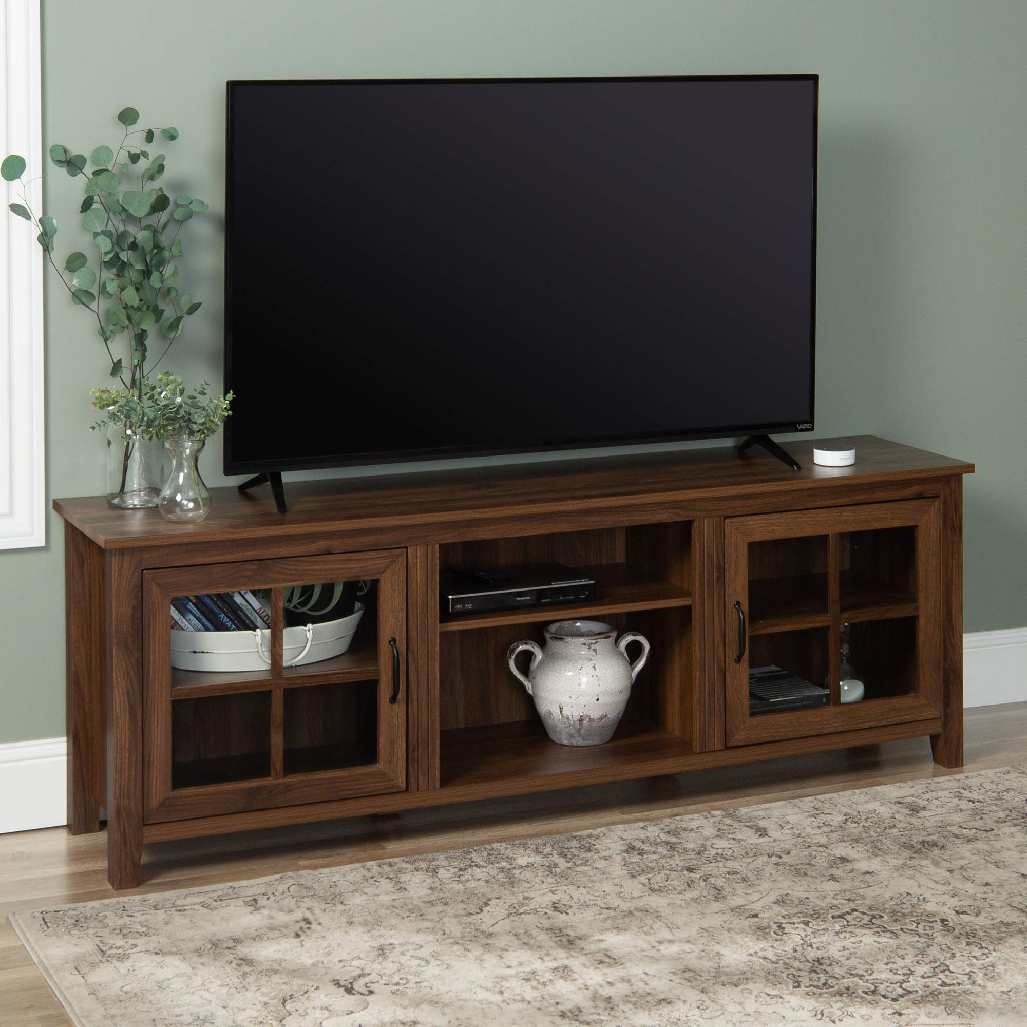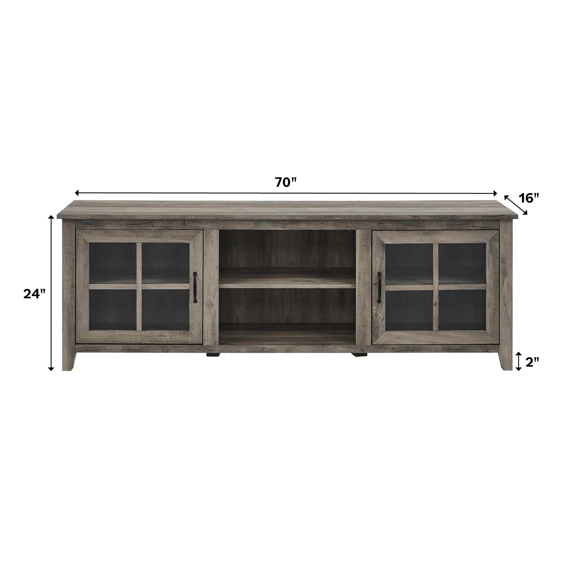 WINDOW PANE GLASS DOORS: Features 2 window pane glass doors with spring-loaded hinges, offering a stylish way to showcase your media components.