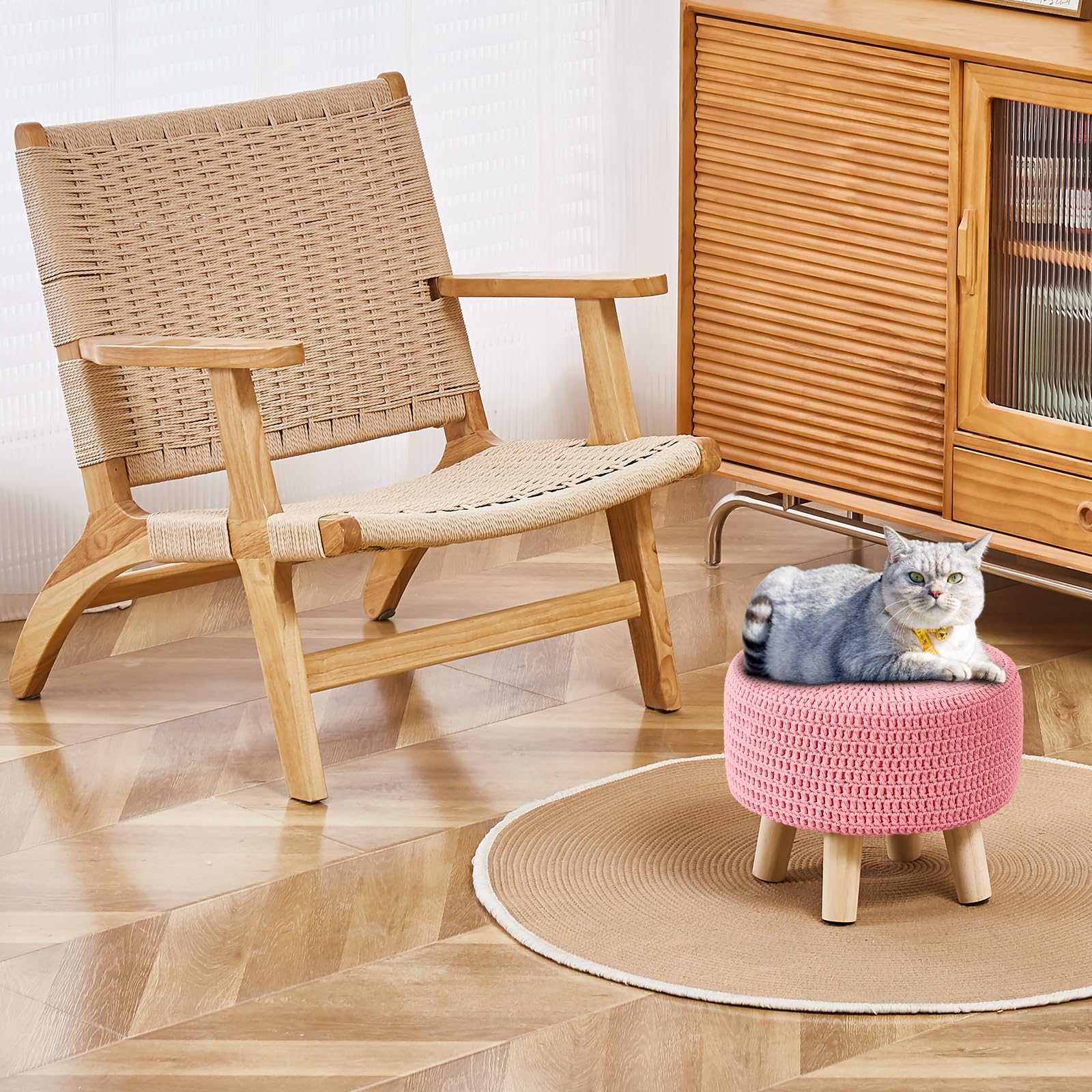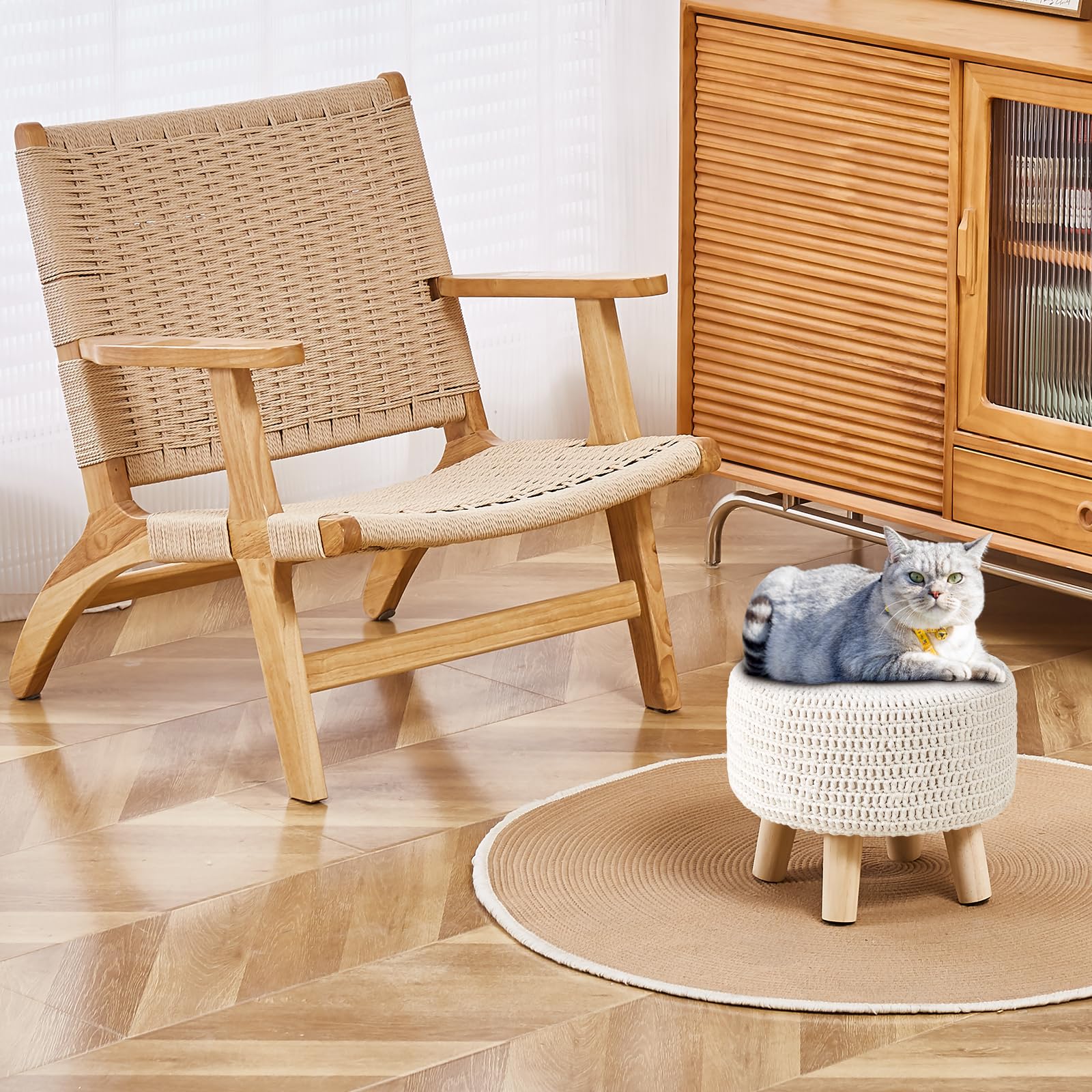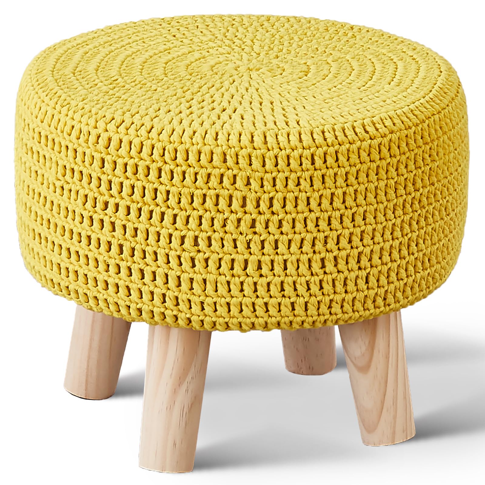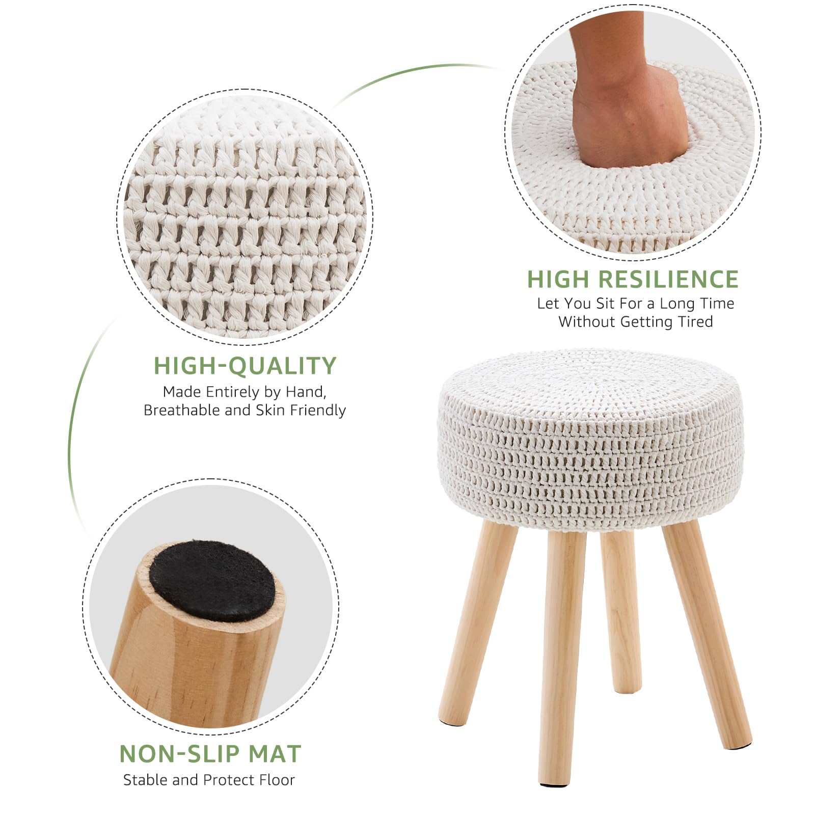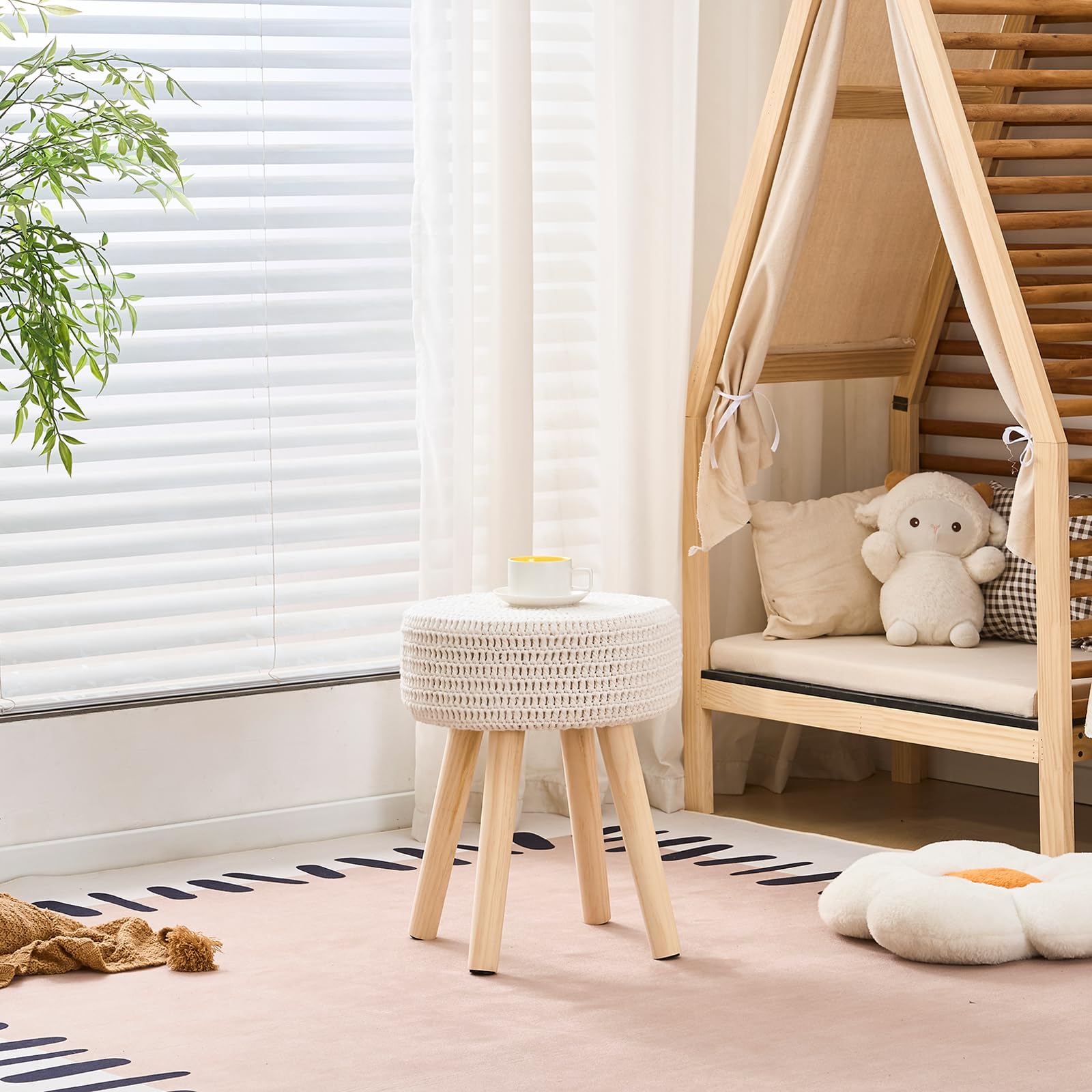 Wimarsbon Pouf Ottoman, 100% Cotton Knitted Boho Footstool, Round Footrest with Non-Skid Wood Legs, Home Décor Handmade Pouffe, Leisure Floor Step Stool for Living Room (Beige)