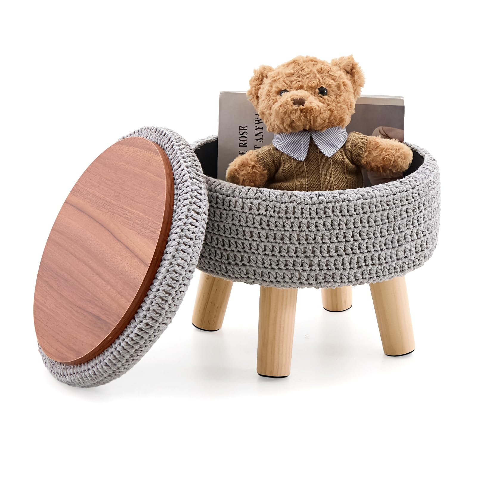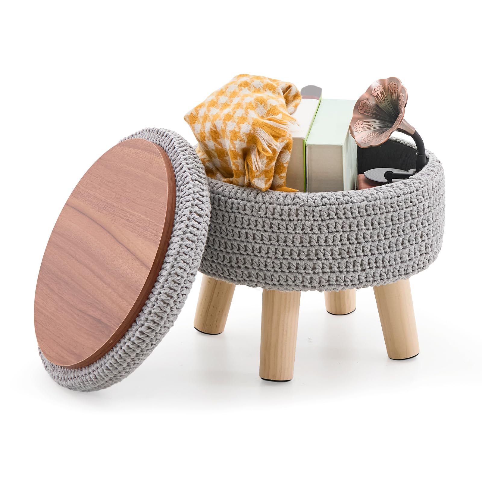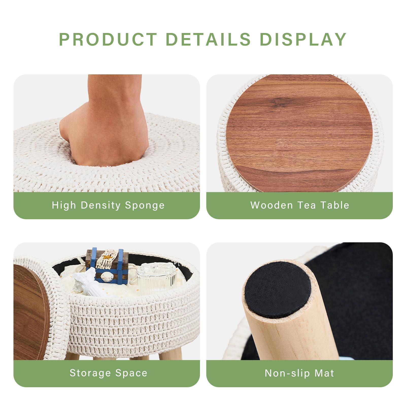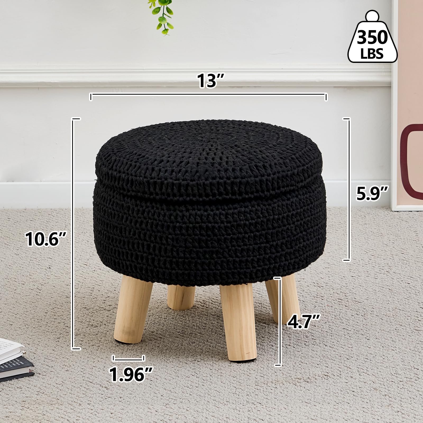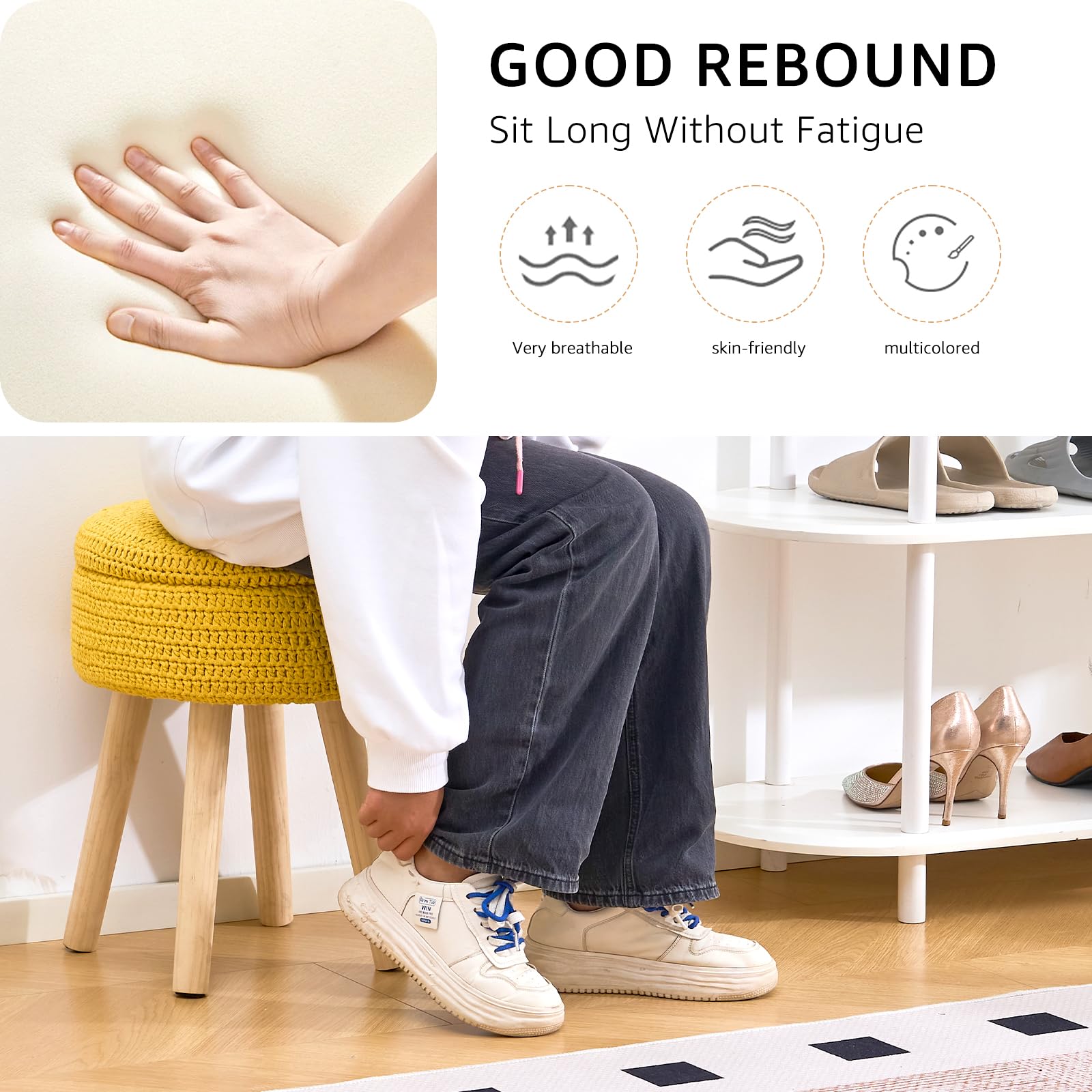 Wimarsbon Pouf Ottoman, 100% Cotton Knitted Boho Footstool, Round Footrest with Non-Skid Wood Legs, Home Décor Handmade Pouffe, Leisure Floor Step Stool for Living Room (Beige)