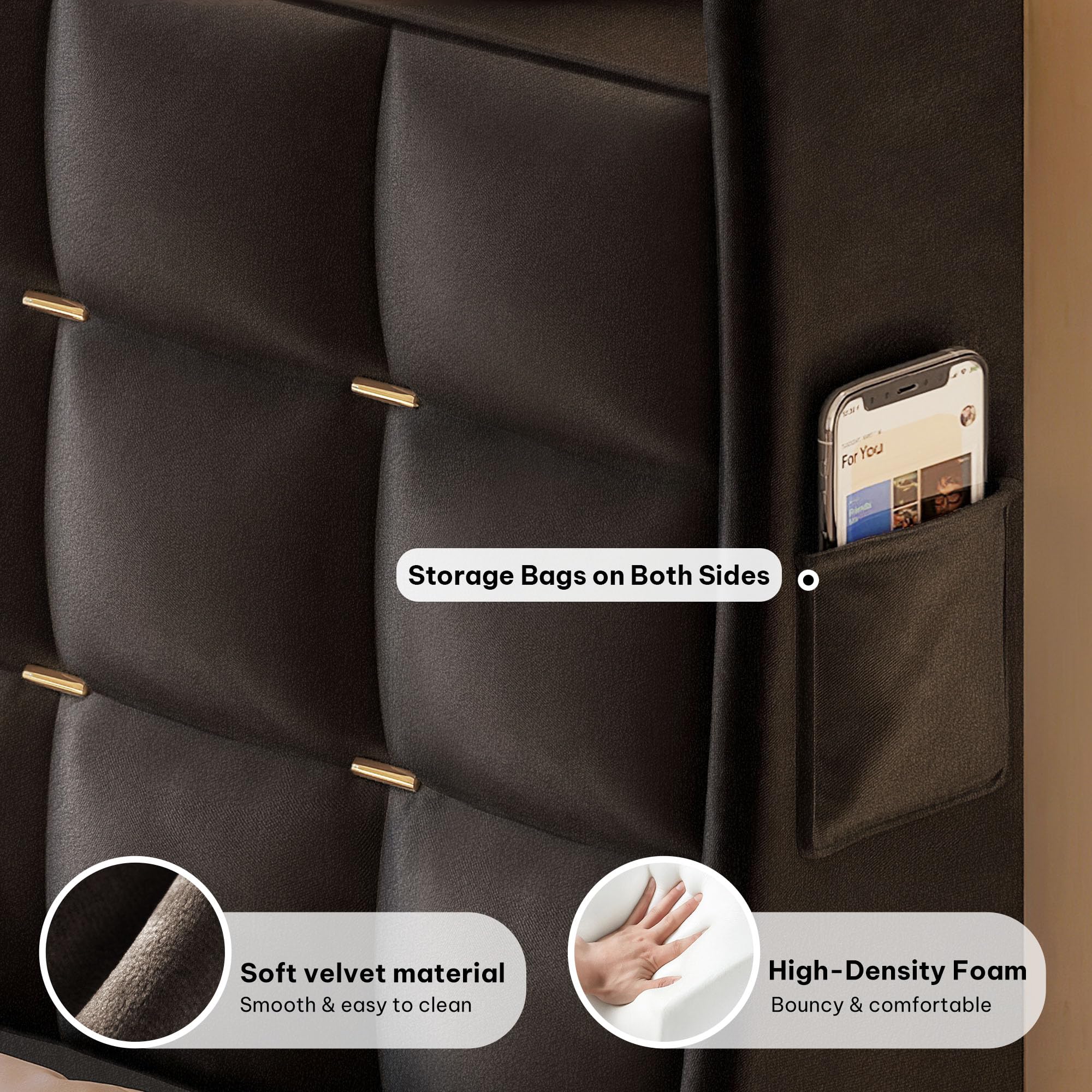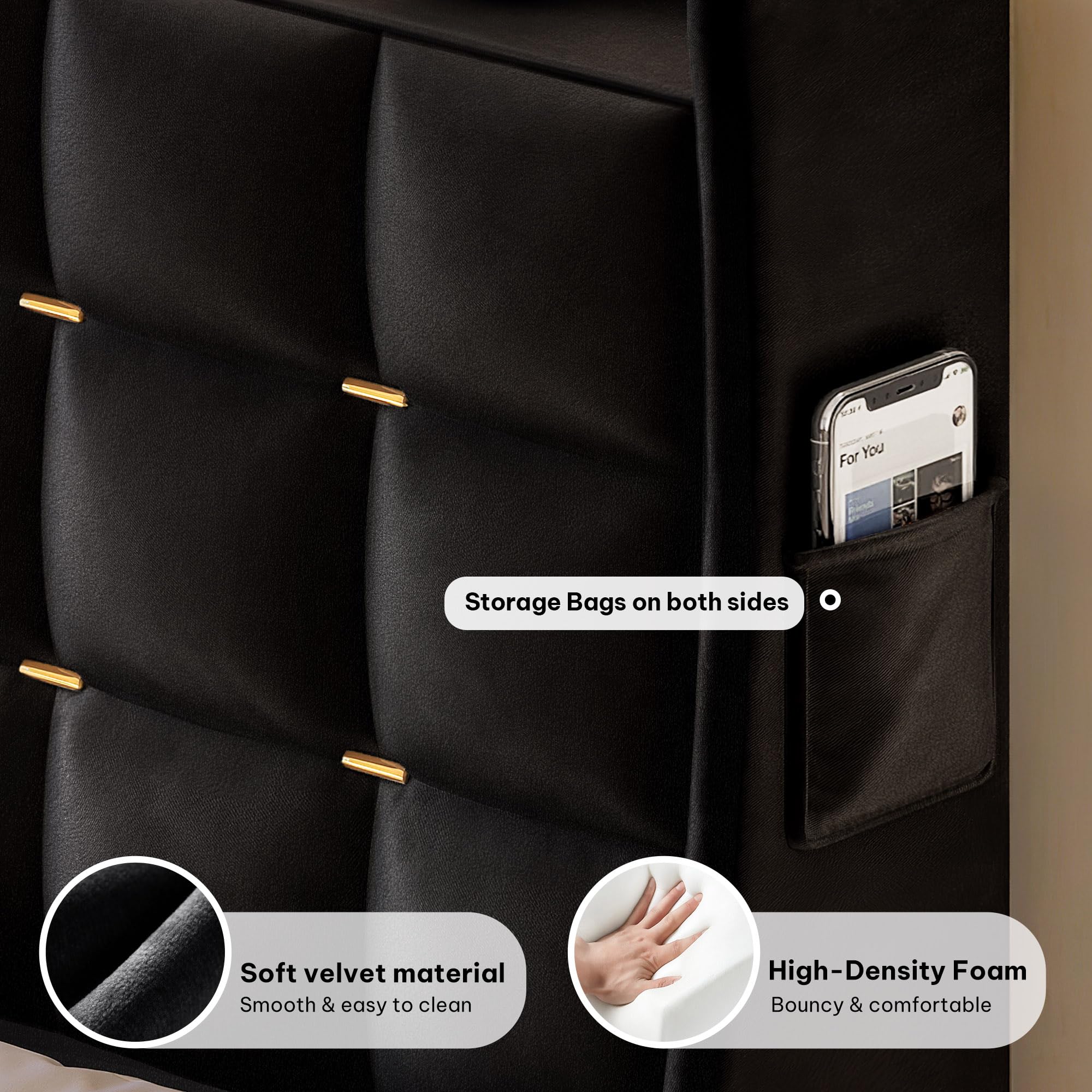 Velvet Upholstered Platform with Charging Station - The king size bed frame built-in charging station, including 2 AC sockets, 2 USB port, charging a variety of electronic devices at your fingertips. Storage shelves on the top provide more storage space for frequently used items such as books, tissue boxes, or your favorite decorations.